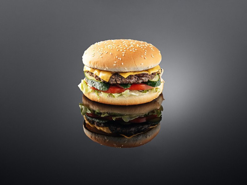 Булка, котлета из говядины, лист салата, помидор, свежий огурец, чеддер, соус