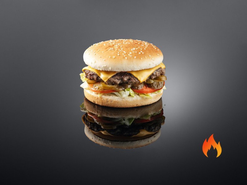 Булка, котлета из говядины, лист салата, помидор, огурец маринованный, чеддер, халапеньо, соус