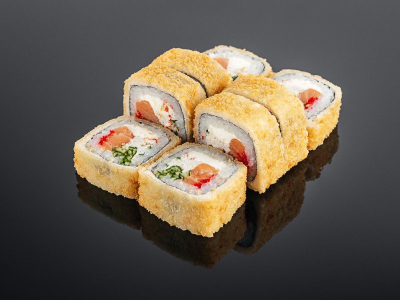 Нори, рис, краб, лосось, сливочный сыр, огурец, тобико
