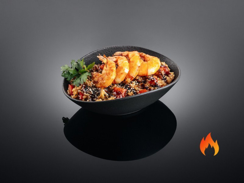 Рис, креветки, болгарский перец, грибы, лук репчатый, соус