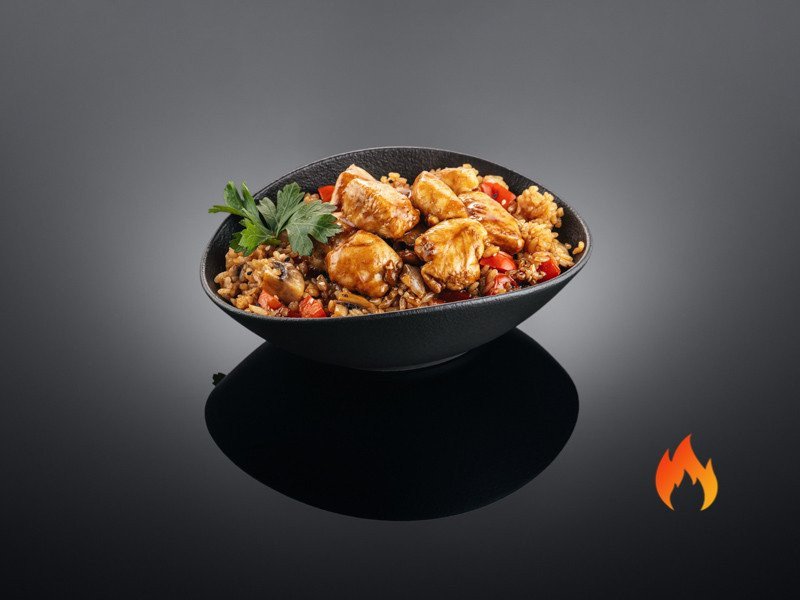 Рис, филе цыпленка, болгарский перец, грибы, лук репчатый, соус