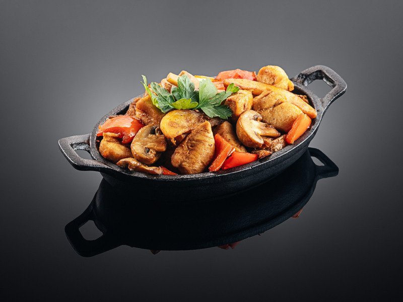 Филе цыпленка, картофель, грибы, лук репчатый, болгарский перец, соевый соус, зелень