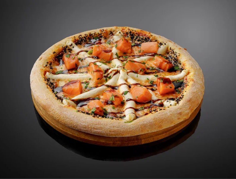 С лососем на красном соусе и сырами: сливочный сыр, пармезан, моцарелла, российский, полита соусом унаги