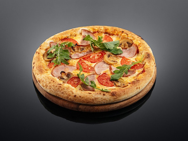 Ветчина индейки, пармезан, моцарелла, российский, грибы, помидоры, томатный соус