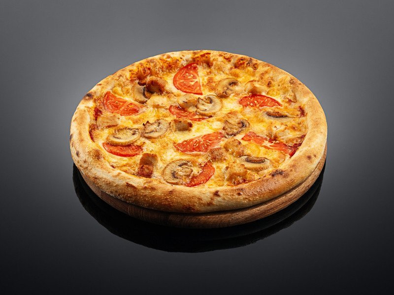 Филе цыпленка, пармезан, моцарелла, сыр российский, грибы, помидоры, томатный соус