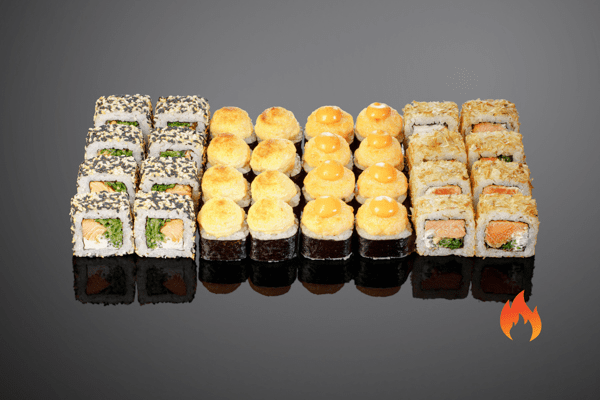 Салмон фрай, арктик, запеченный ролл нокс, запеченный лосось с крабом