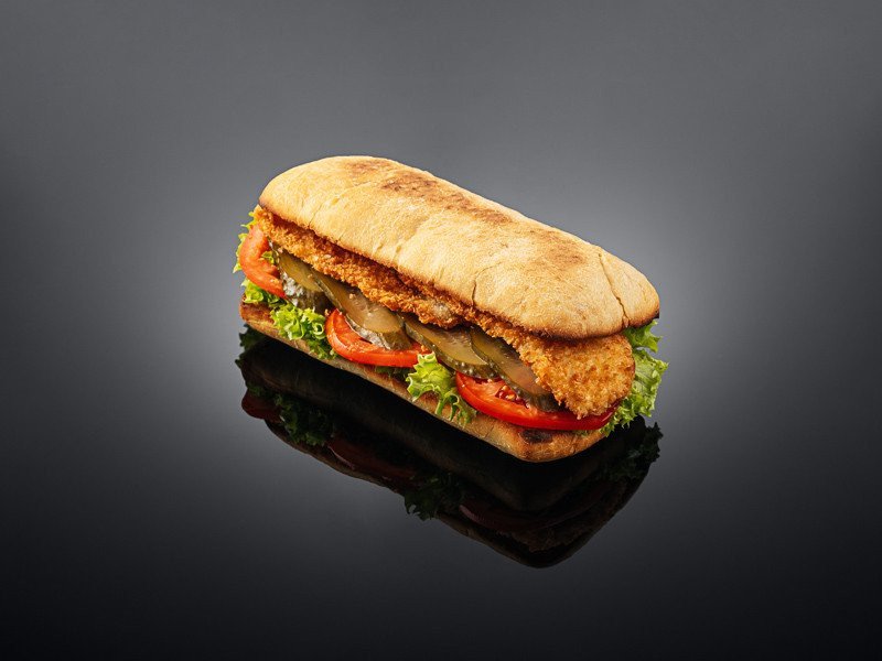 Чиабатта, соус, сыр российский, мацарелла, пармезан, филе цыпленка в панировке, маринованный огурец, помидор, лист салата