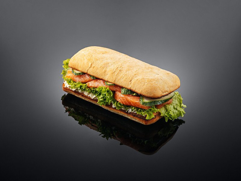 Чиабатта, сливочный сыр, лосось слабосоленный, огурец, лист салата