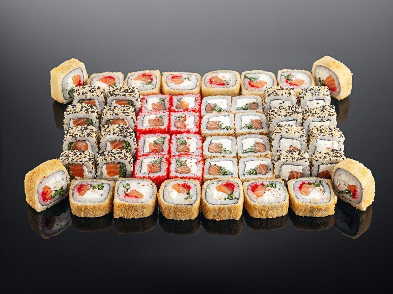 Бонито с лососем, калифорния с лососем, аляска, тайский, япоша, горячий ролл калифорния