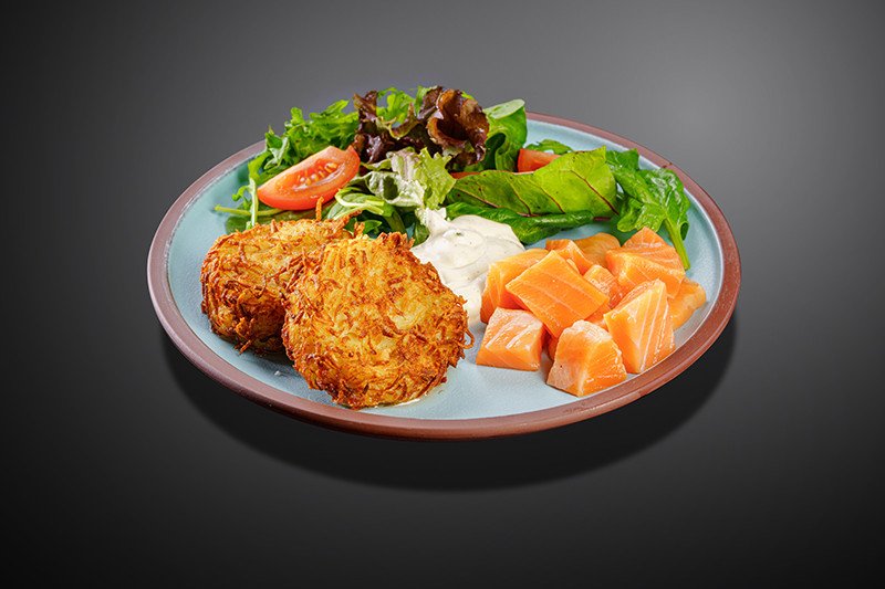 картофельные оладушки, лосось, микс зелени, помидоры черри, соевый соус, лимонный сок, белый соус