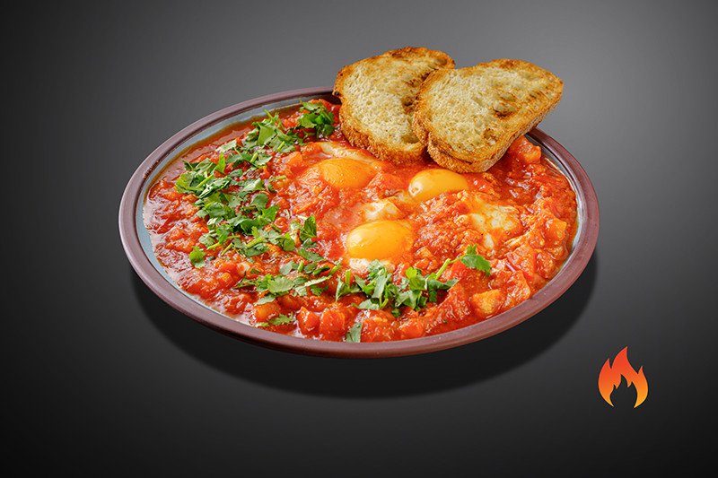 яйца, помидоры, томатный соус, зелень, острый соус, хрустящие тосты